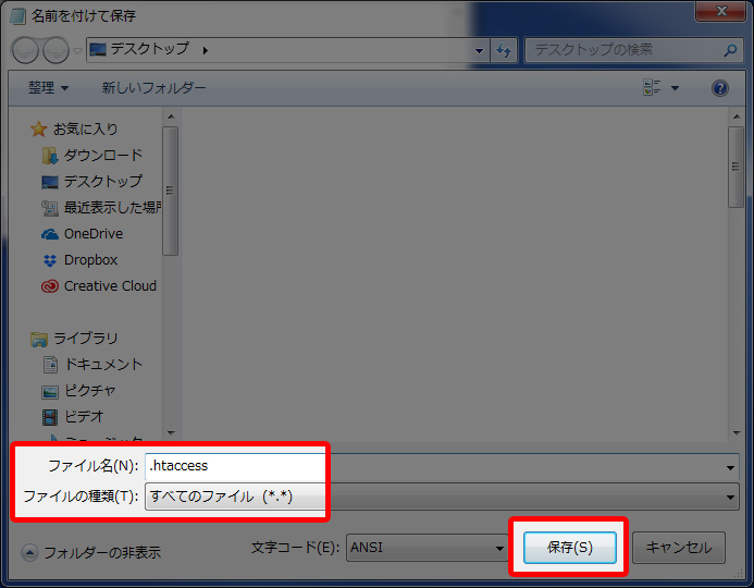メニューバーの『ファイル』⇒『名前を付けて保存』をクリックして、ファイルの種類を『すべてのファイル』へ変更し、ファイル名に『.htaccess』と入力して『保存』してください。