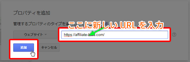 まずは新しく使用する予定のドメイン(URL)をGoogleConsoleに登録します。