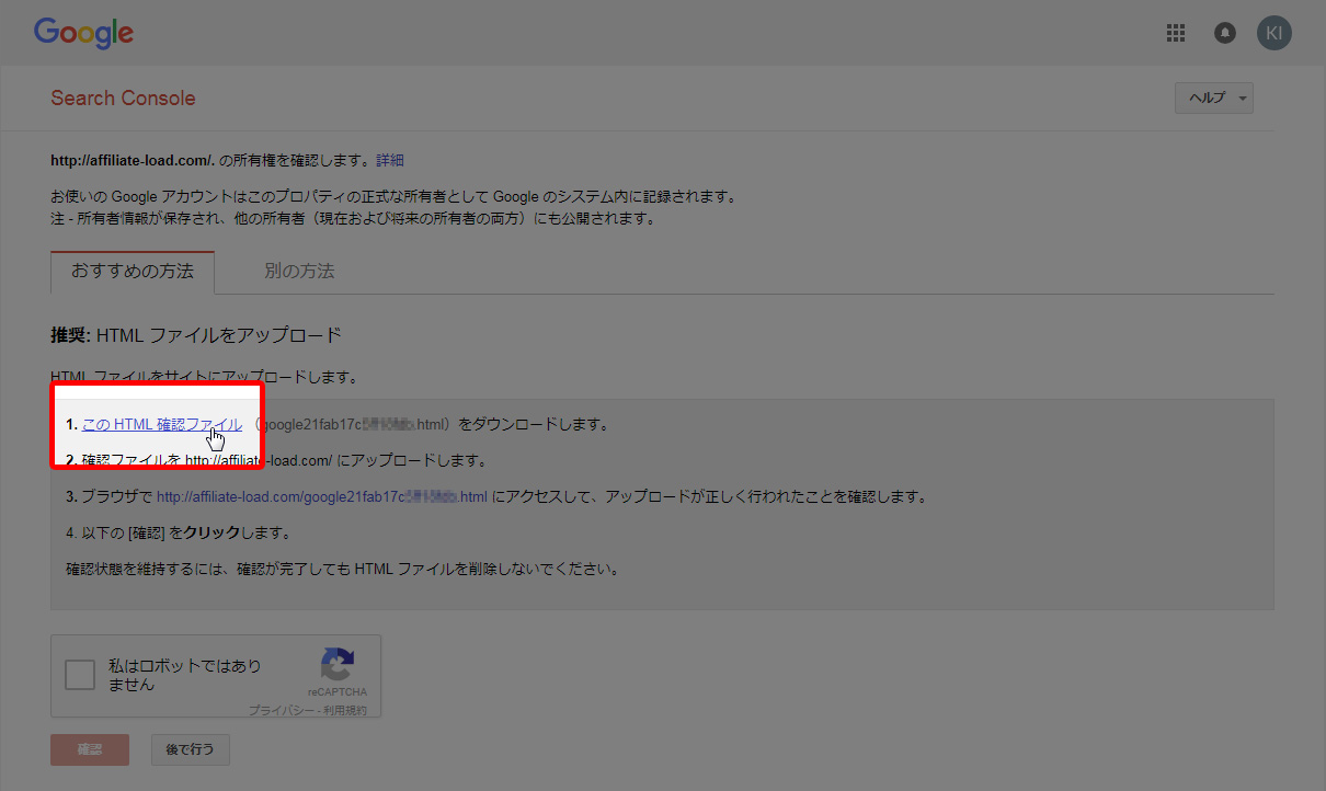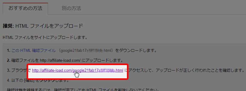 これでGoogle検索エンジンに、そのサイトの所有者であるという事を伝える準備ができたので、『3』のURLをクリックします。