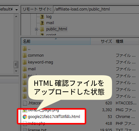 下記のようなHTMLファイルがダウンロードされるので、FTPソフトなどを使ってサイトのTOPディレクトリ(URLの一番上の階層)にアップロードします。