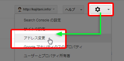 GoogleConsoleで旧ドメインのステータス画面を開き、右上にある『歯車アイコン』⇒『アドレス変更』をクリックします。