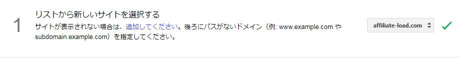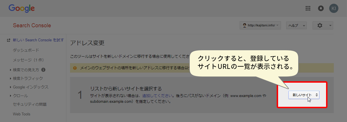 新しいサイト』をクリックすると、GoogleConsoleに登録してあるサイトURLの一覧が表示されるので、先ほど登録した引越し予定の新しいURLを選択します。