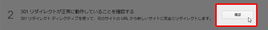 次に301リダイレクトが正常に動作しているかを確認するため『確認』ボタンをクリックします。動作確認には数秒かかりますので、結果が表示されるまでそのまま待っていましょう。