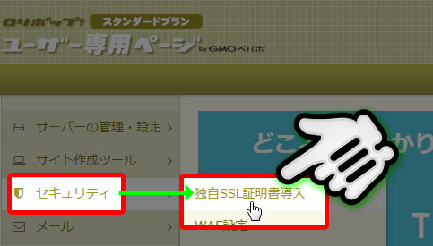 まずはロリポップ!のユーザーページへログインし、メニューから『セキュリティ』⇒『独自SSL証明書導入』をクリックします。