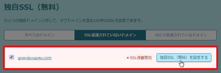 SSL化されていないURLは『×SSL保護無効』と表示されているので、SSL化したいドメインの横のチェックボックスにチェックを入れて『独自SSL(無料)を設定する』をクリックします。