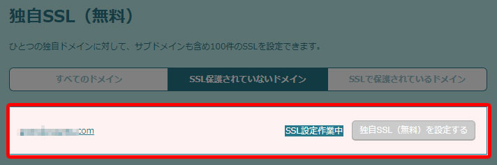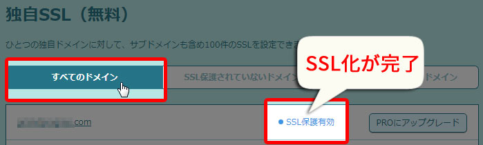 少し時間を置いて『すべてのドメイン』タブをクリックすると、『●SSL保護有効』になっていると思います。状況によって時間は異なると思いますが、私の場合は10分後くらいに確認したら設定が終わっていました。