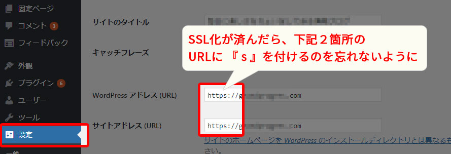 SSL化が済んだら、ワードプレスの設定画面から登録しているURLもSSL化しておきましょう。