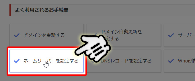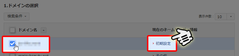 1.ドメインの選択でネームサーバーを書き換えたいドメインにチェックを入れます。