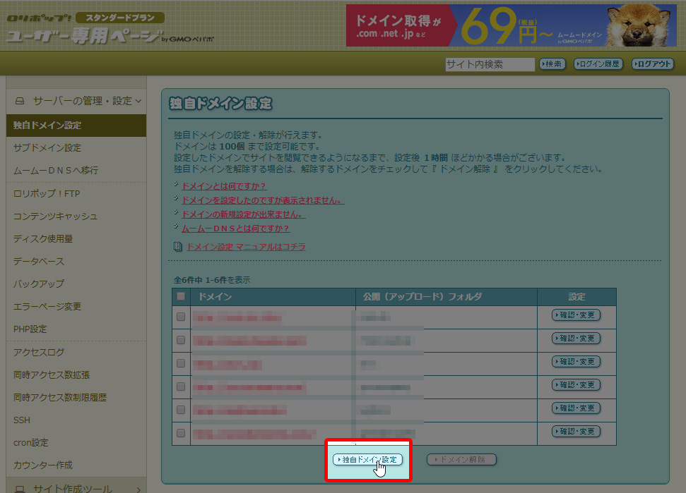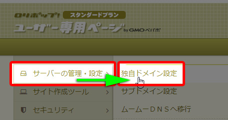 『サーバーの管理・設定』⇒『独自ドメイン設定』をクリックします。