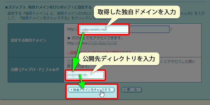 お名前ドットコムで取得した独自ドメインと、公開先(ロリポップで借りているサーバーのディレクトリ(フォルダ))を入力して『独自ドメインをチェックする』をクリックします。