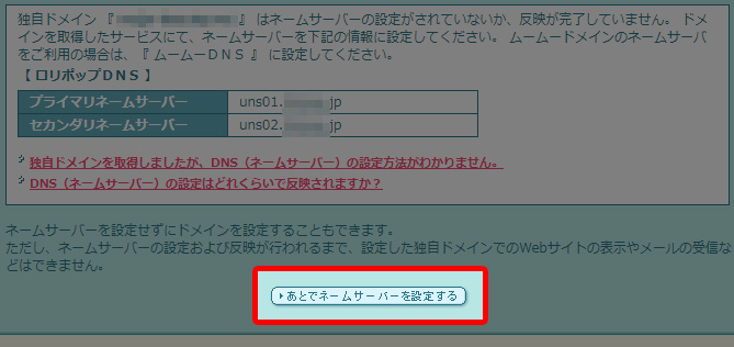 お名前ドットコムでネームサーバーを書き換えた後、すぐに独自ドメインの設定をした場合(設定後から反映されるまでの間)下記のようなメッセージが表示されます。すでに書き換えは済んでいるので、『あとでネームサーバーを設定する』をクリックします。