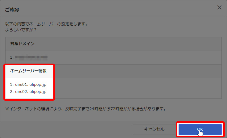 『対象ドメイン』と『ネームサーバー情報』を確認したら『OK』をクリックします。