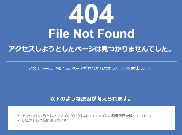 ※ページデザインなどはサーバー設定により違いますが、『404』と書かれたエラーページが出ればOKです。