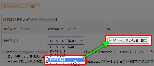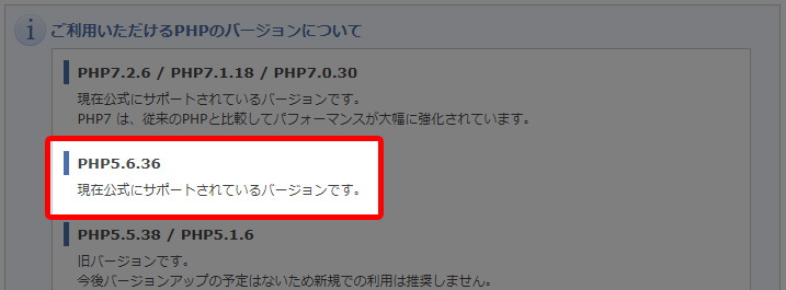 現状は最新版の『PHP7.2.6』になっていますが、『PHP5.6.36』と『PHP5』の一番新しいバージョンへ切り替えます。