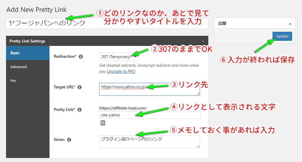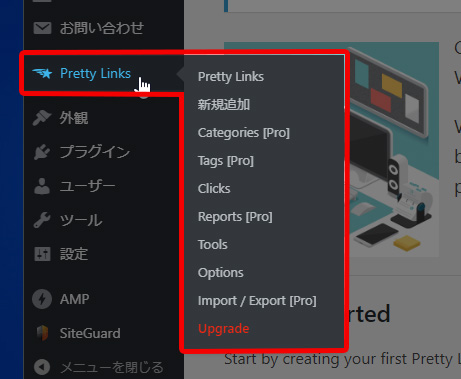 もし移動されない場合はワードプレスの左メニューに『Pretty Links』の項目が増えているのでそちらから設定画面に移動してください。