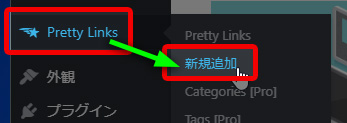プラグインの有効化が完了したら、ワードプレスメニューから『Pretty Links』⇒『新規追加』をクリックします。