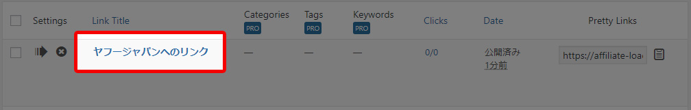 Pretty Linkの設定ページで作ったリンクの右にあるコピーボタンをクリックします。