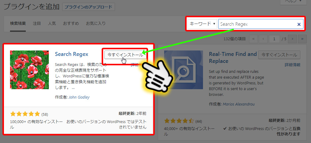 『プラグインを追加』画面で、検索窓へ『Search Regex』と入力して検索し、出てきたプラグインを『今すぐインストール』します。