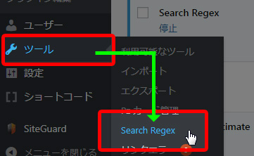 まず、ワードプレス管理画面のメニューから『ツール』⇒『Search Regex』をクリックします。